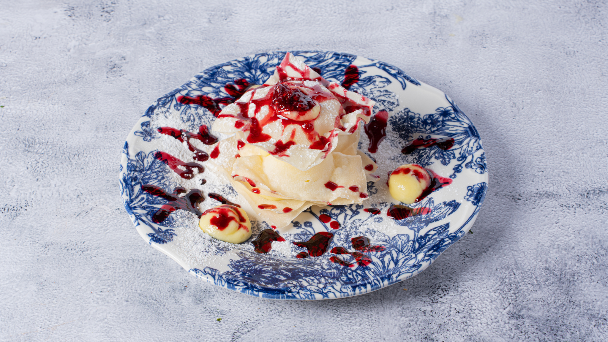 Crispy wonton layers, yuzu pastry cream and red berry coulis