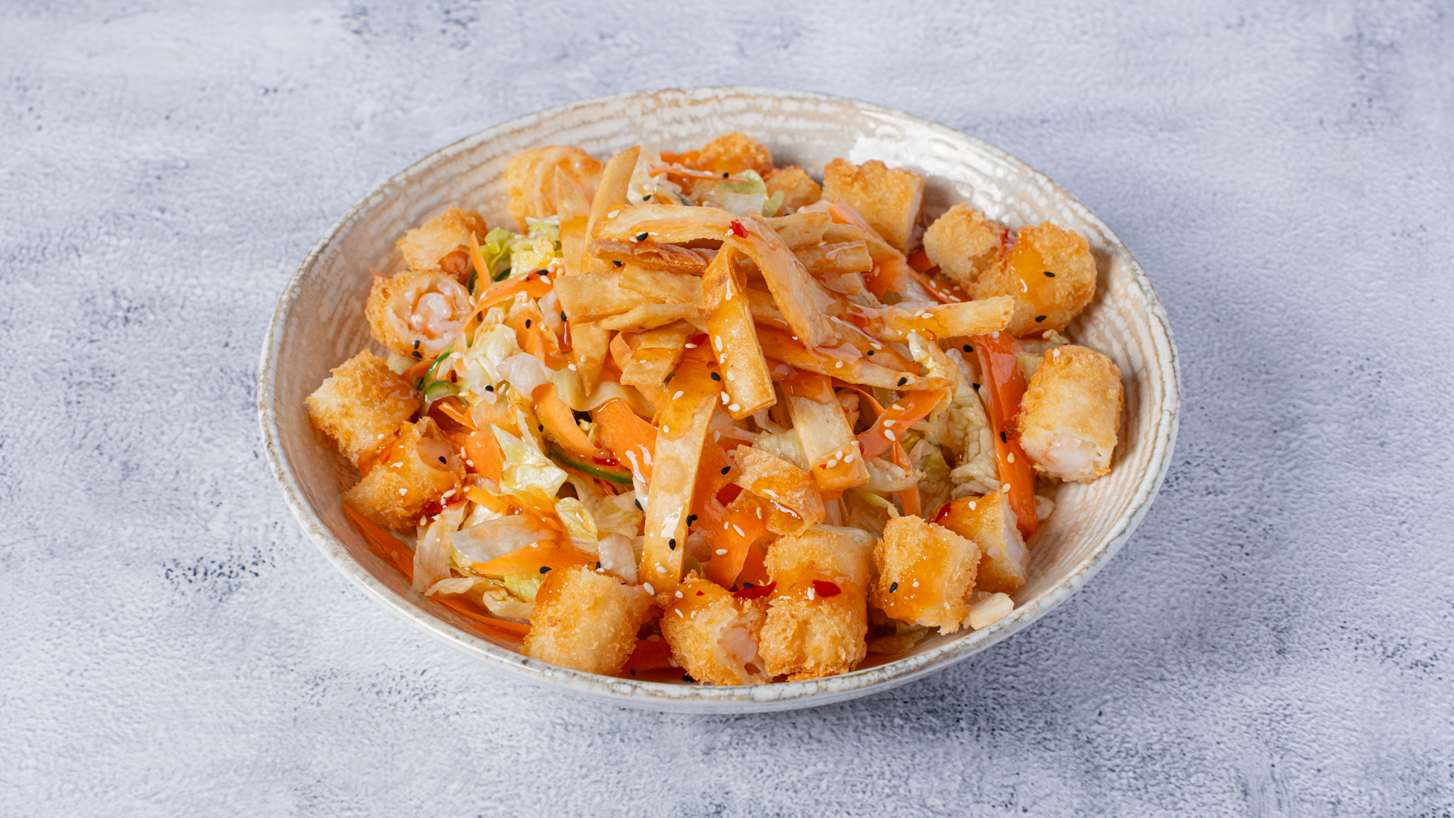 Iceberg, tempura shrimps, carrot, cherry tomatos, tortilla croutons, sweet chili, mayo-citrus dressing