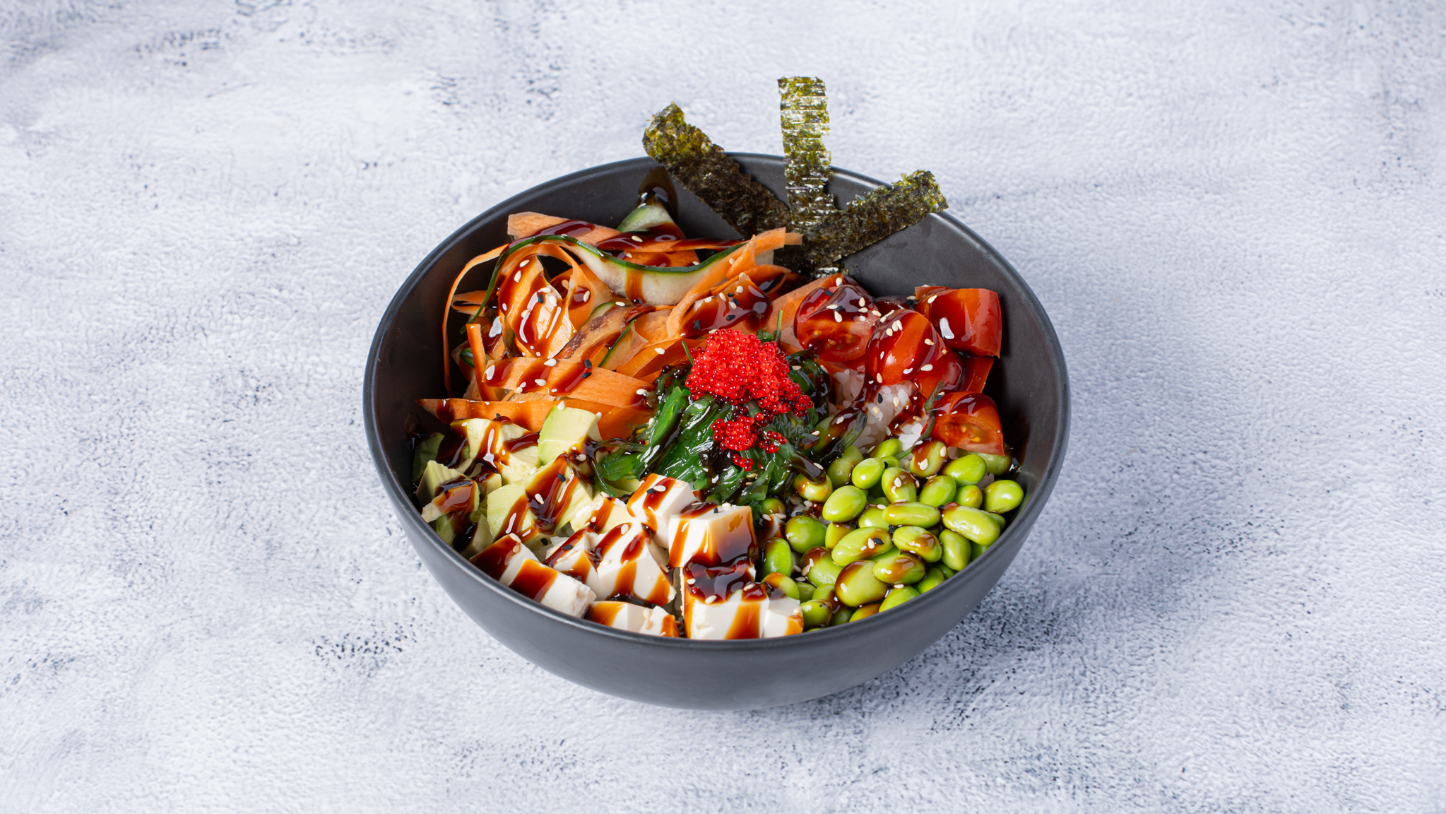 Rice with frech vegetables ( avocado, edamae, cucumber, carrots, tobico, tofu, nori, unagi sauce