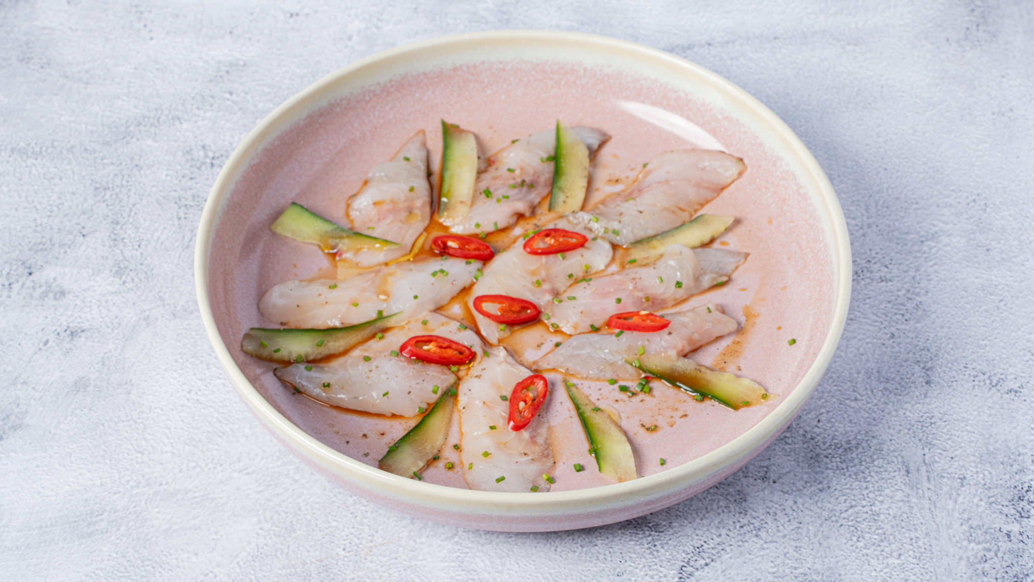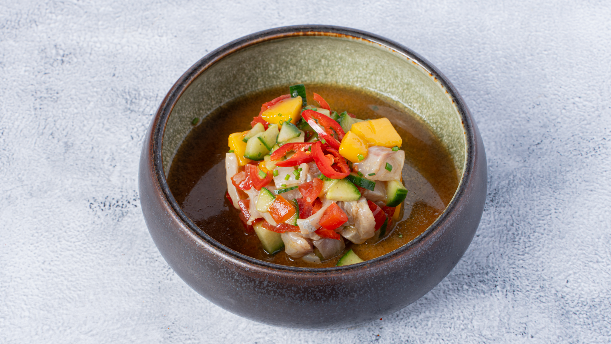 Seabass,cucumber, mango, tomato cherries, yuzu-ponzu, pikled cucumber, green oil, chili, chives.