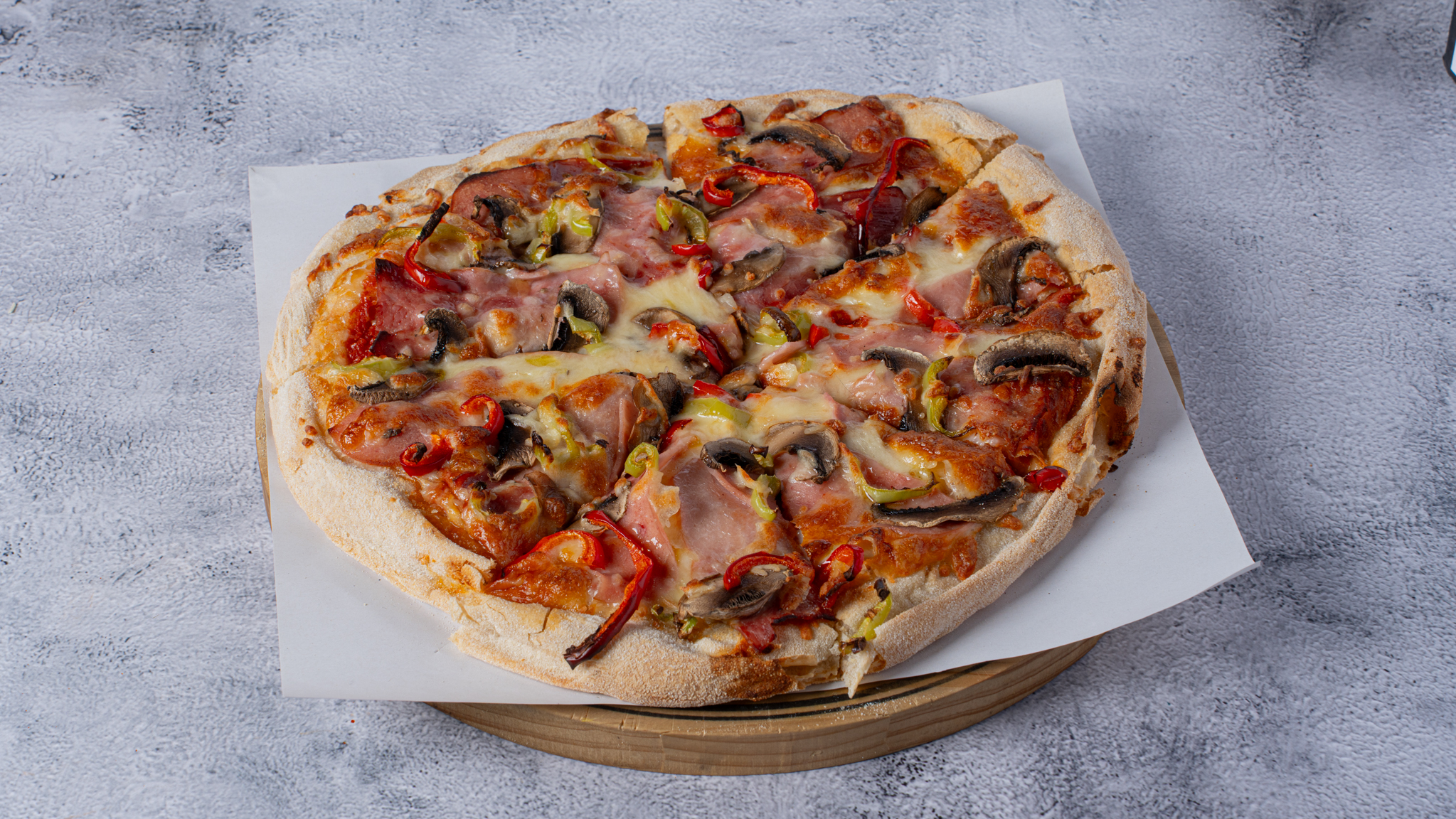 With tomato sauce, mozzarella, bacon, ham, mushroom, peppers.