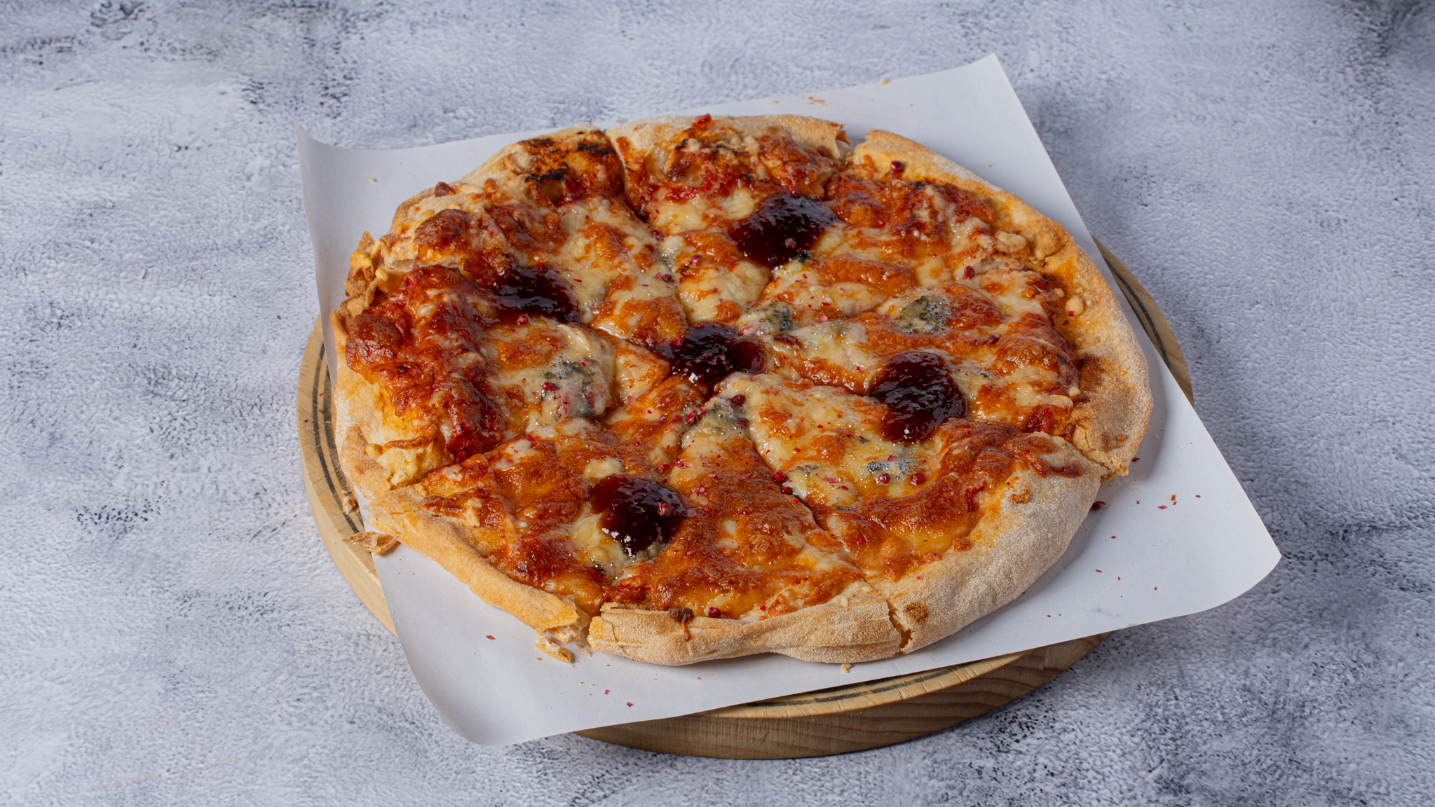 With tomato sauce, mozzarella, gorgonzola, gruyere, parmigiano. chutney fig.