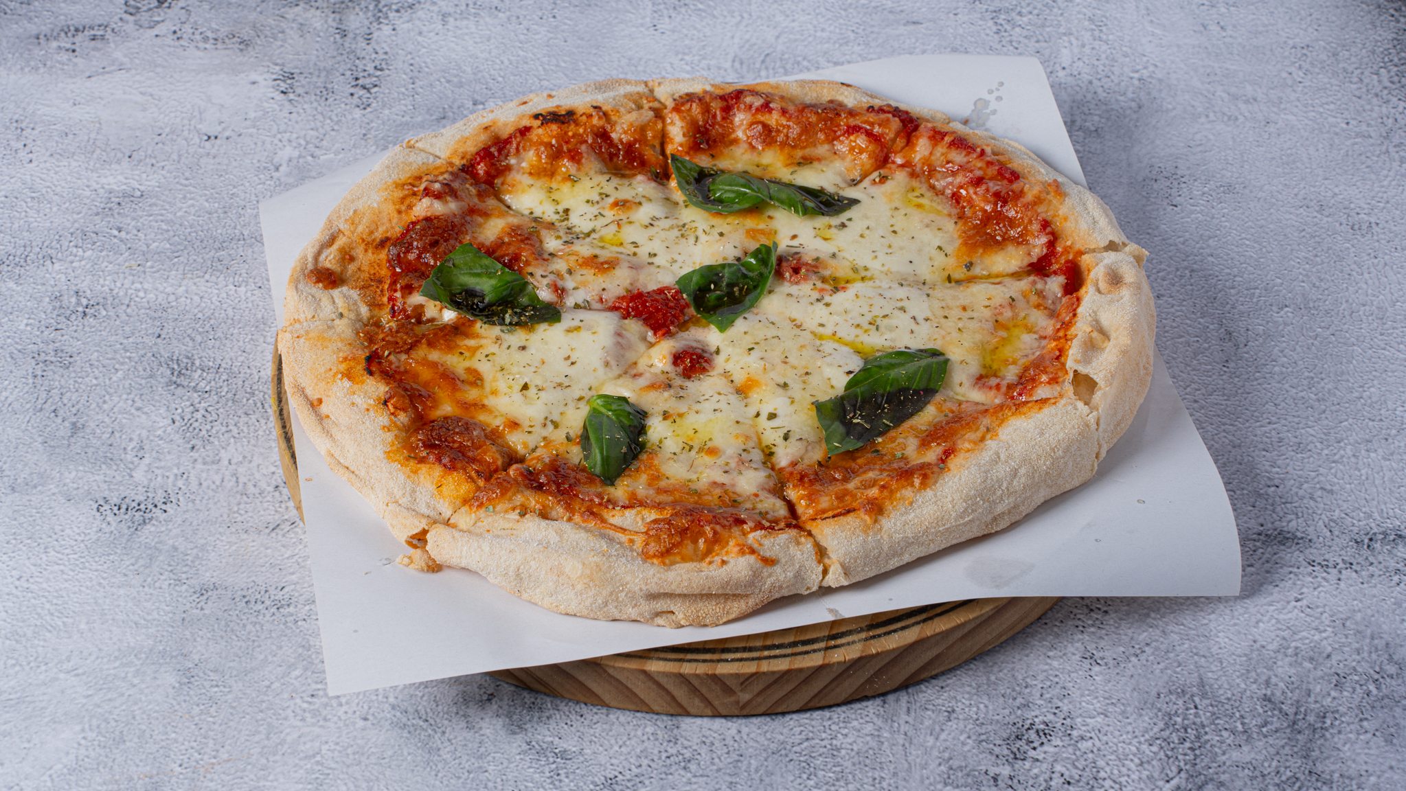 With tomato sauce, mozzarella, fresh basil,