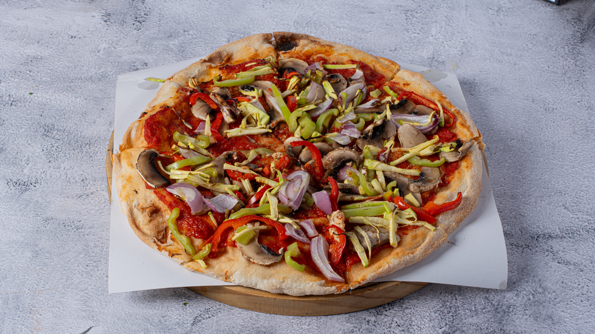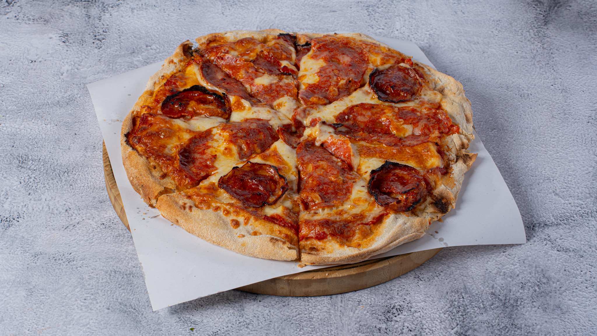 With tomato sauce, mozzarella, chorizo, peperone, sun-dried pesto.
