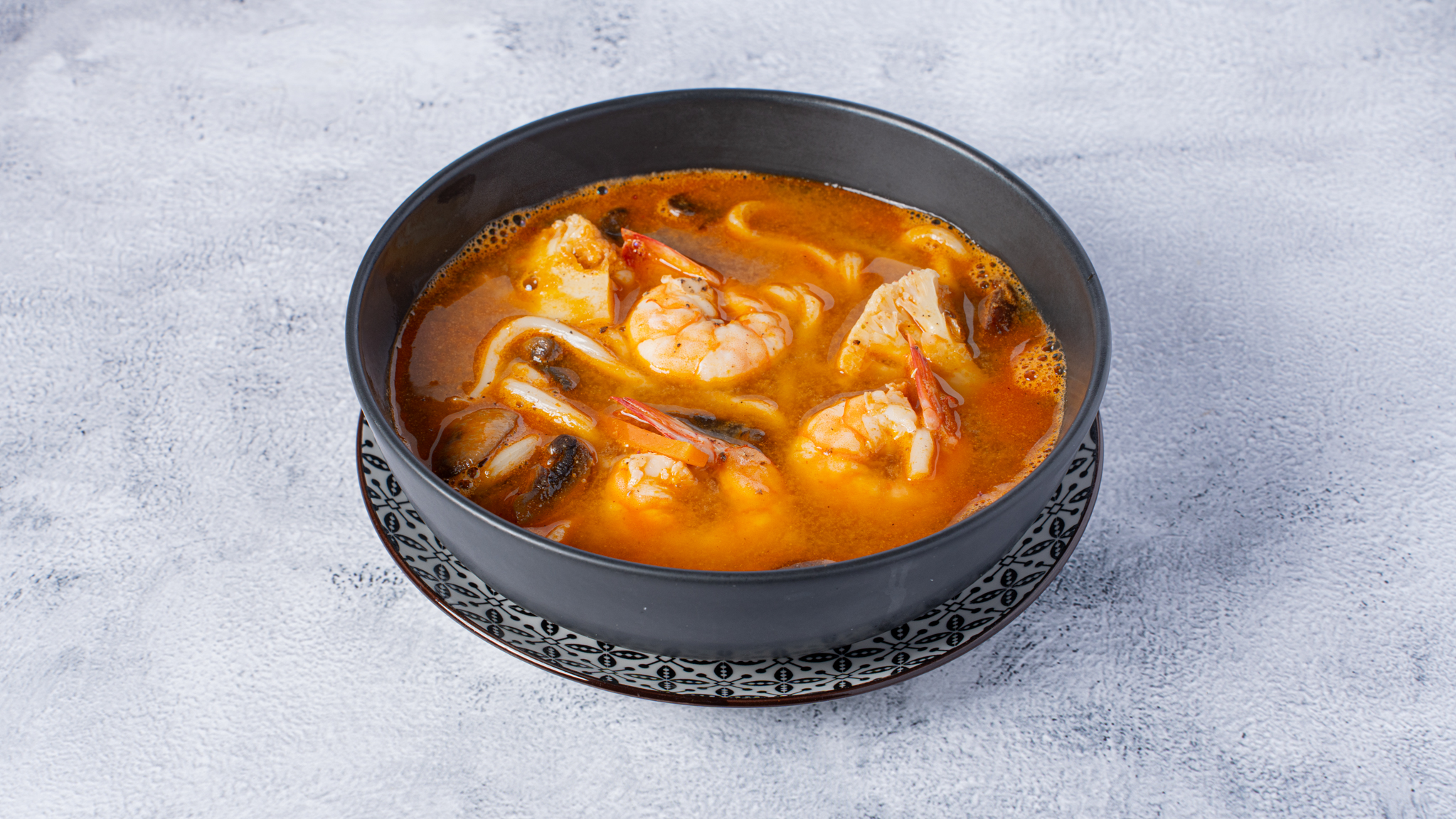 Ramen soup with handmade fresh bisque , shrimps, vegetables.