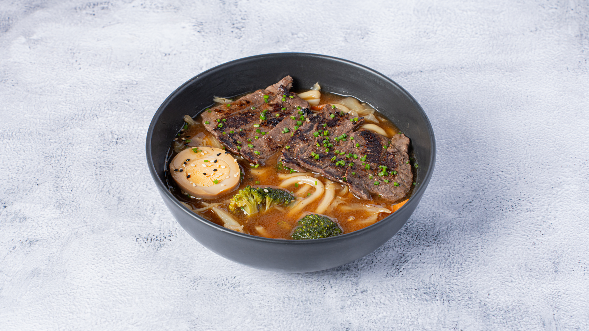Ramen soup with beef, udon noodles, soy marinade egg and vegetables.