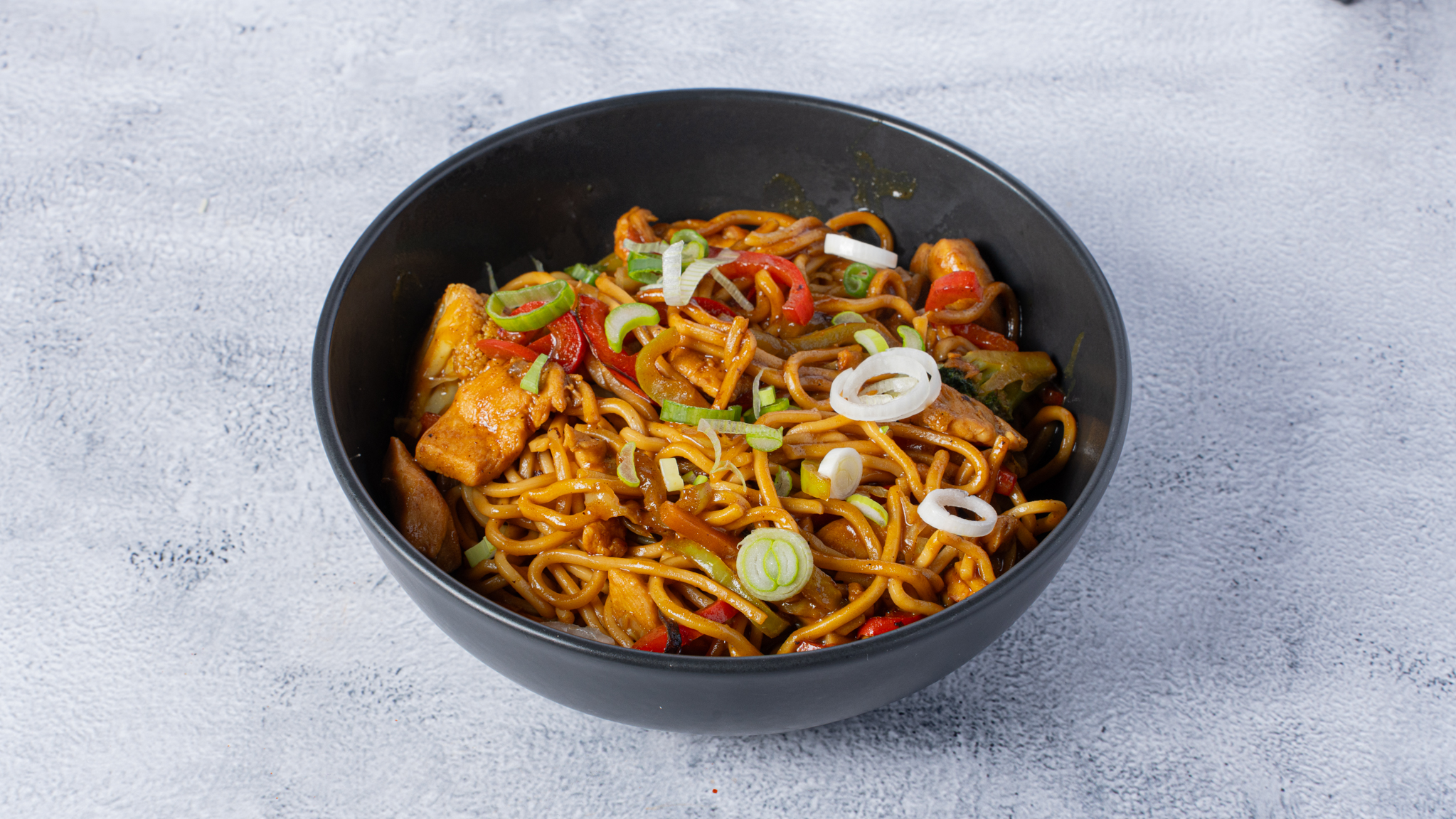 Noodles with chicken, vegetables, curry sauce & coconut cream.